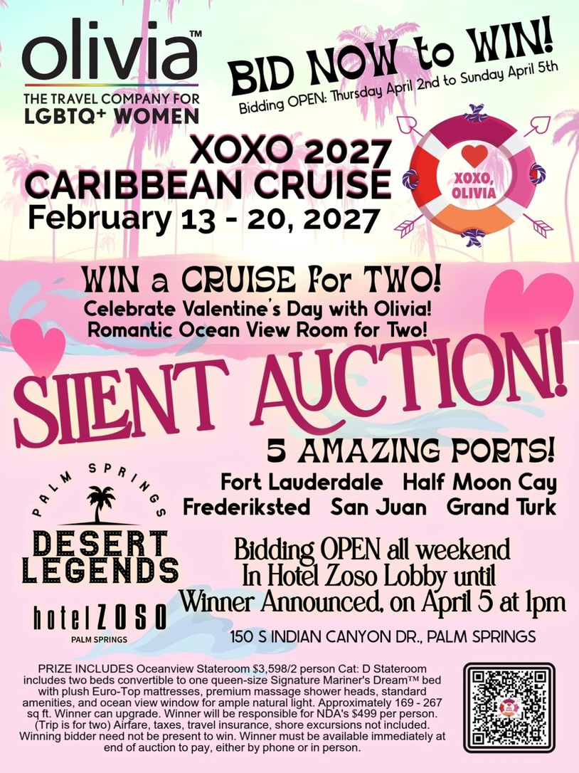 Bidding starts April 2nd and YOU could win!! Bid on items and experiences like gold star massage, hair and makeup, Desert Legends swag, and this amazing Caribbean Cruise with our title sponsor OLIVIA!
