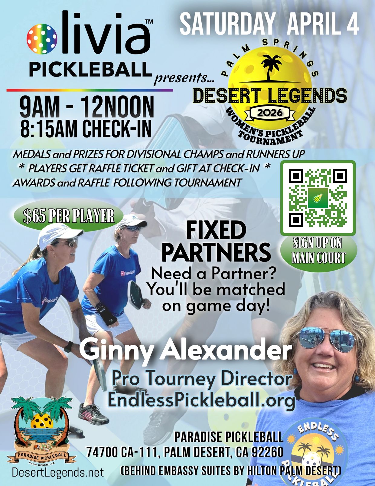 You are in for a treat to be in the great company of Ginny Alexander, our pro pickleball tourney director! She's got tons of experience and knows how to keep things moving on the court to make your day a guaranteed blast.
